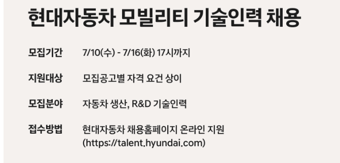 ▶현대자동차 페이스북 페이지 구독하기→ 상시채용 신규 공고를 가장 빠르게 전달받아 보실 수 있습니다.