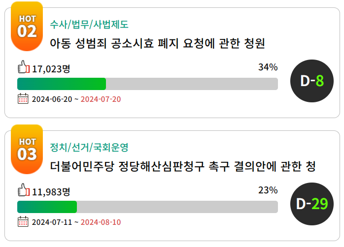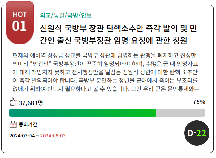 국민동의청원홈페이지에 진행중인 청원중 성립조건이 완료된 청원은 청 다섯건이 있으며 윤석열탄핵 청원은 140만건으로 급발진 의심 사고 발생시 입증책임 전환을 위한 제조물책임법 개정에 관한 청원이 8만8천,교제폭력 관련 제도 개선 요청에 관한 청원8만5천,윤석열 대통령 탄핵소추안 발의 반대에 관한 청원 8만2천,밀양 집단 성폭행 사건 처벌과 가해자 신상공개에 관한 청원6만4천명이 각각동의를 마쳤으며 현재 진행진행중인 청원중, 신원식 국방부 장관 탄핵소추안 즉각 발의 및 민간인 출신 국방부장관 임명 요청에 관한 청원과 더불어민주당 정당해산심판청구 촉구 결의안에 관한 민주당해산 청원건이 성립 전 동의 진행 중에 있습니다. 7월11일 청원진행된 민주당해산 청원은 현재 1만명이 동의가 이루어졌으면 계속적으로 증가하고 있는 현상입니다.