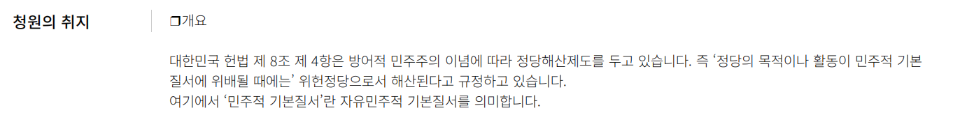 대한민국헌법 제 8조 제 4항과 헌법재판소법 제 55조의 법문상, 정당의 목적이나 활동이 자유민주적 기본질서에 위배될 경우 정당해산 사유가 되고, 정부는 국무회의의 심의를 거쳐 헌법재판소에 정당해산 심판을 청구할 수 있습니다.민주당의 경우, 앞에서 본 바와 같이 그 활동이 자유민주적 기본질서인 국민주권주의, 권력분립제도, 사유재산과 시장경제를 골간으로 하는 경제질서, 사법권 독립 등에 위배되므로 명백한 위헌 정당입니다.라고 마무리하고 있습니다. 민주당해산 청원에 동의하고자 하시는분들은 링크를 통해 진행 하시기 바랍니다.