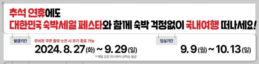 대한민국 기획재정부 추석 민생안정대책으로 2024.8.28일 발표진행된 하나로 사용기한이 연장되어 배포되는숙박할인쿠폰 (입실기간이 11월말까지 가능할 예정) 발급에 대해서는 시스템이 준비되는 대로 추후 다시 안내드릴 예정이며,현재 발급되는 숙박쿠폰은 10월 13일까지 입실 가능하며, 쿠폰은 권종(2만원권, 3만원권)과사용기한(입실기한 2024년 10월 13일 또는 11월말)에 상관없이 1회에 한해 사용 가능한 점 주지하시고 쿠폰을 발급받아 주시기 바랍니다.