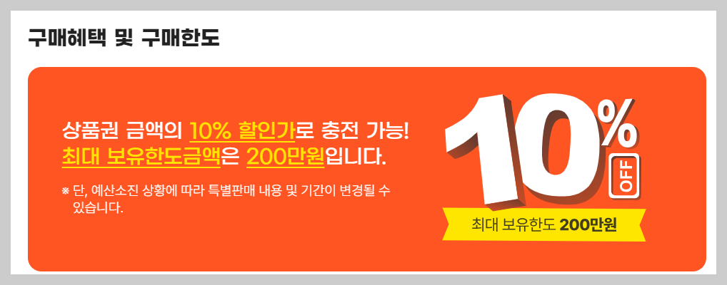 할인율은 발행기관(중소벤처기업부 및 소상공인시장진흥공단)에서 설정하며, 충전 시 상세내역에서 확인 가능합니다. 상품권 충전 시 고객확인 제도에 따라 자금 세탁 거래 여부를 검증합니다.
