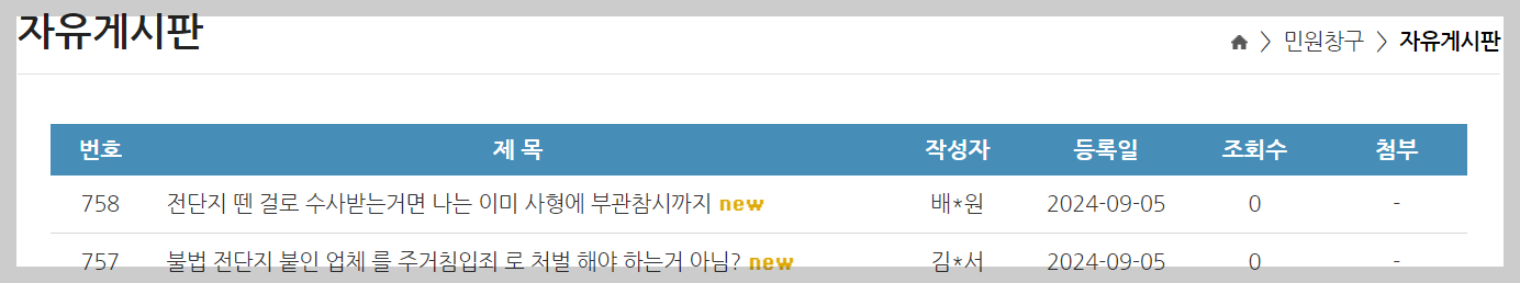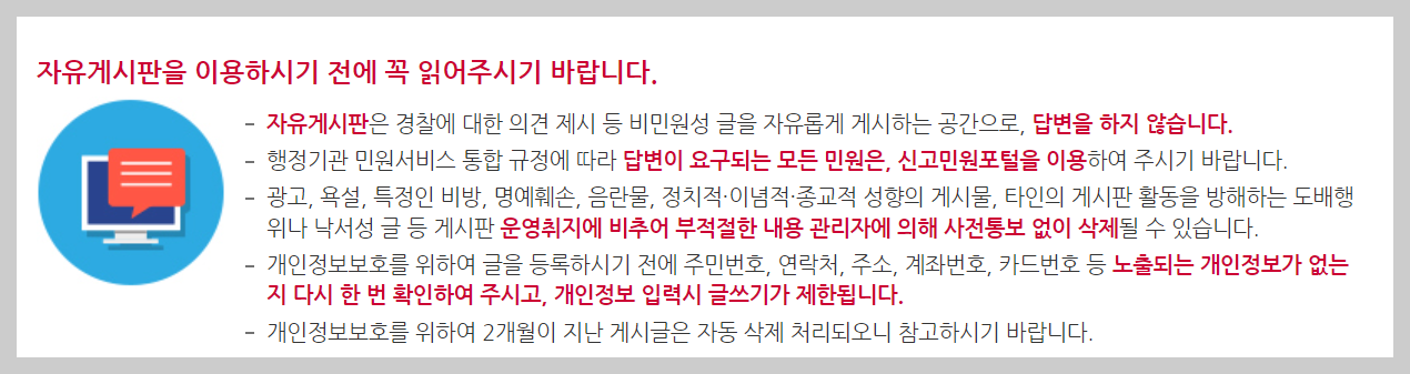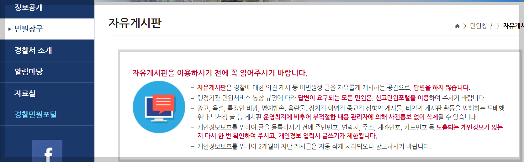 자유게시판은 경찰에 대한 의견 제시 등 비민원성 글을 자유롭게 게시하는 공간으로, 답변을 하지 않습니다.행정기관 민원서비스 통합 규정에 따라 답변이 요구되는 모든 민원은, 신고민원포털을 이용하여 주시기 바랍니다.광고, 욕설, 특정인 비방, 명예훼손, 음란물, 정치적·이념적·종교적 성향의 게시물, 타인의 게시판 활동을 방해하는 도배행위나 낙서성 글 등 게시판 운영취지에 비추어 부적절한 내용 관리자에 의해 사전통보 없이 삭제될 수 있습니다.개인정보보호를 위하여 글을 등록하시기 전에 주민번호, 연락처, 주소, 계좌번호, 카드번호 등 노출되는 개인정보가 없는지 다시 한 번 확인하여 주시고, 개인정보 입력시 글쓰기가 제한됩니다.개인정보보호를 위하여 2개월이 지난 게시글은 자동 삭제 처리되오니 참고하시기 바랍니다.