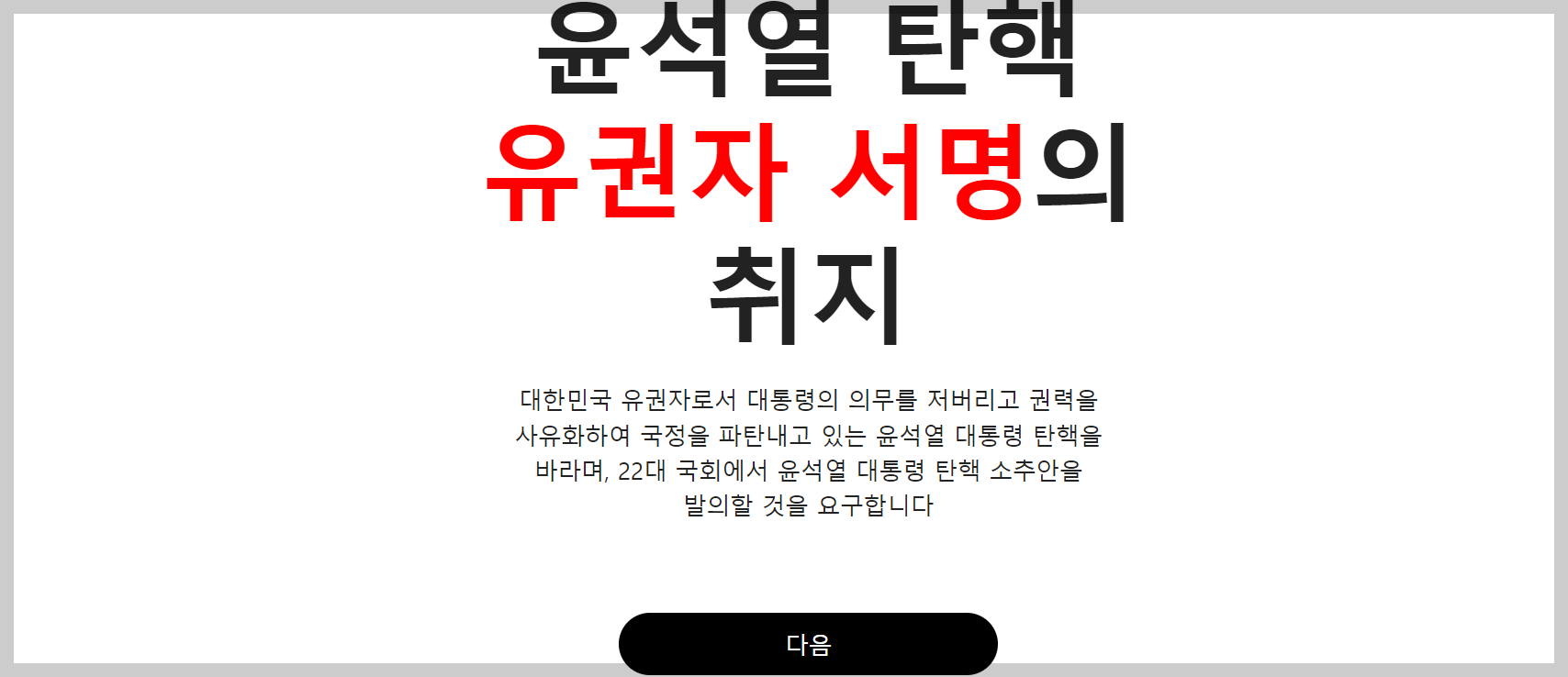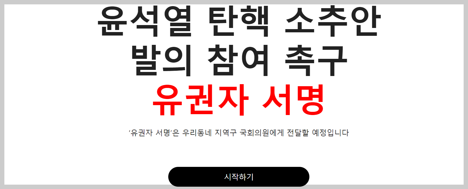 3. 시작하기를 선택합니다. 대한민국 유권자로서 대통령의 의무를 저버리고 권력을 사유화하여 국정을 파탄내고 있는 윤석열 대통령 탄핵을 바라며, 22대 국회에서 윤석열 대통령 탄핵 소추안을 발의할 것을 요구합니다 취지내용을 확인후 다음을 선택합니다.
