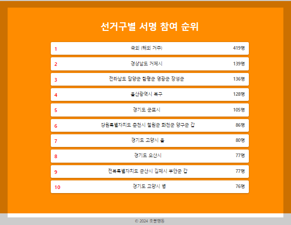 탄핵명령 지도에서도 각 지역구의 국민이 명령한다. 윤석열을 탄핵하라! 윤석열 탄핵 소추안 발의 참여 촉구관한 서명 참여자수 실시간으로 확인이 가능합니다. 탄핵지도는 PC 환경에 적합하며 마우스를 지도에 올리면 해당 지역의 서명 동참 수를 확인할 수 있습니다.