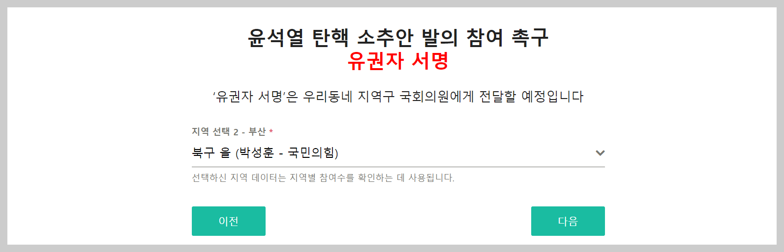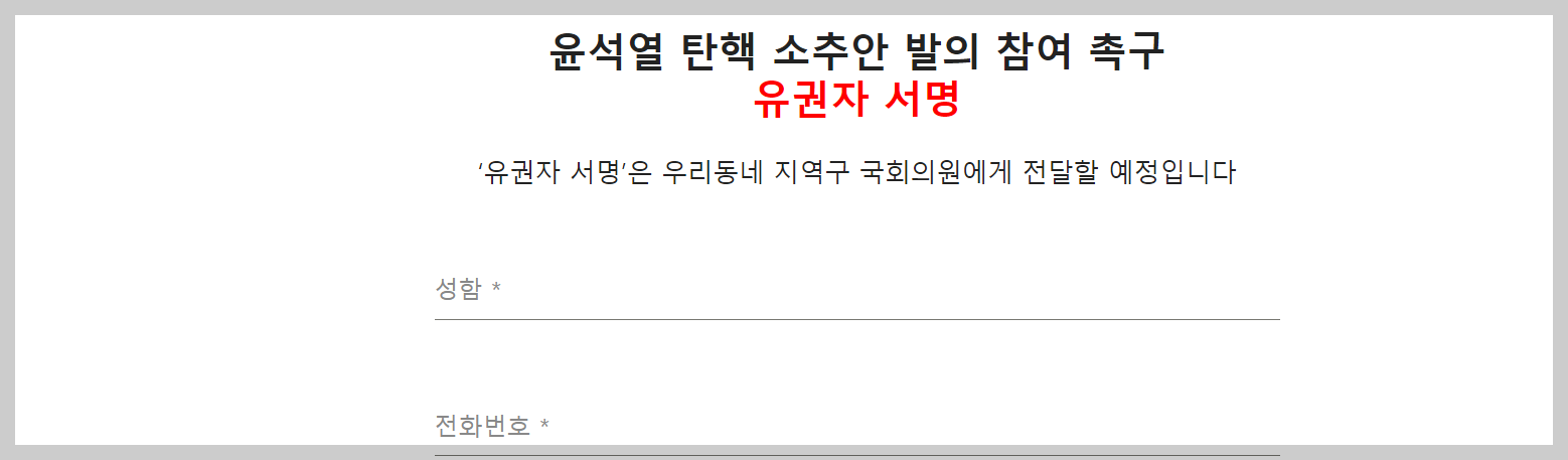 탄핵명령 사이트에서 진행하고 있는 윤석열을 탄핵하라! 윤석열 탄핵 소추안 발의 참여 촉구관한 서명은 대한민국 유권자로서 누구나 참여 할 수 있으며 내 지역구의 국회의원에 이를 전달 할 수 있습니다. 서명은 매우 간단하며 아래 와 같이 함께 동참하시면됩니다.