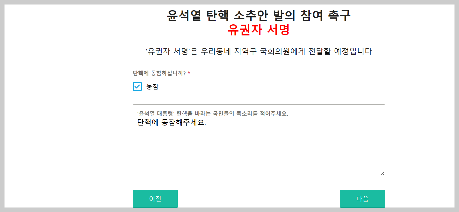 7. 탄핵에 동참하십니까? 의 박스체크한후 본인이 하고자 하는 말을 작성합니다.