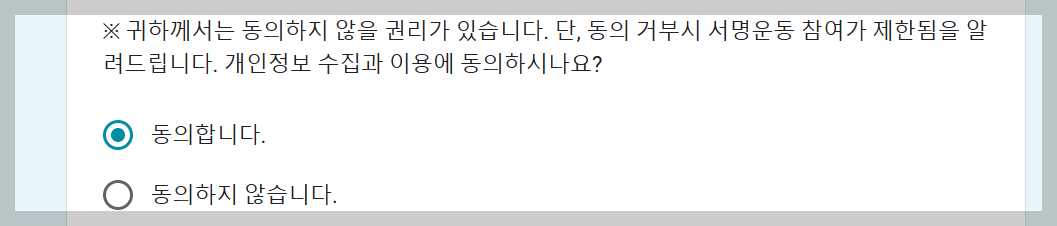 7.개인정보 취급 동의에 동의합니다.에 체크합니다.귀하께서는 동의하지 않을 권리가 있습니다. 단, 동의 거부시 서명운동 참여가 제한됨을 알려드립니다.