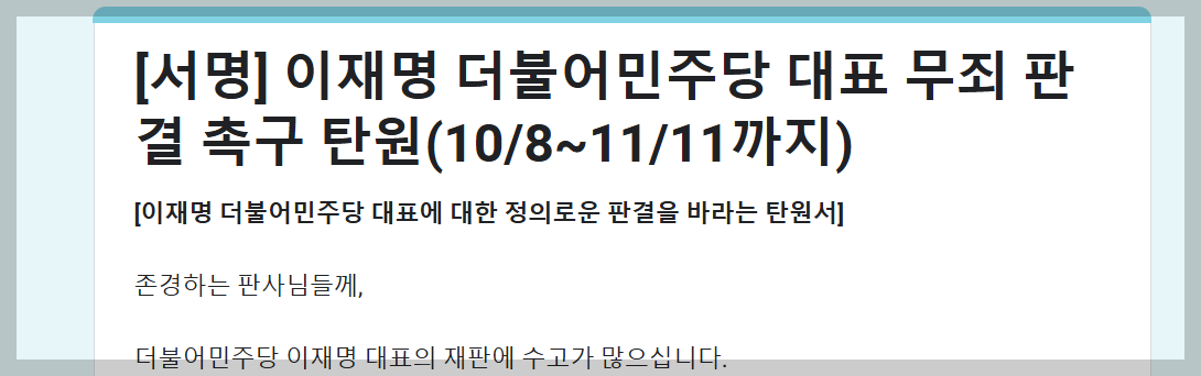 이재명무죄탄원 서명 닷컴에서는 이재명을 지킵시다! 이재명불어민주당 대표 무죄판결 촉구탄원서명이 진행되고 있습니다. 이재명 무죄탄원 서명 닷컴에서는 판사님들의 헌법과 법률 그리고 양심에 따른 판단과, 많은 국민들의 정의와 상식이 일치하리라 믿고 있습니다. 부디 검찰권 남용으로 닥친 헌정사의 세 번째 위기 앞에서는 앞선 두 사례와 달리 사법부가 보여준 용기가 역사로 기록되길 바라고 또 바랍니다.라고 밝히고 있으며 이재명무죄탄원 서명 목표는 100만명을 목표로 하고 있으며 현재 11월7일 70만명을 돌파하여 30만명이 부족한 상태입니다.