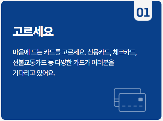 1. 마음에 드는 카드를 고르세요. 신용카드, 체크카드,선불교통카드 등 다양한 카드가 여러분을기다리고 있어요.