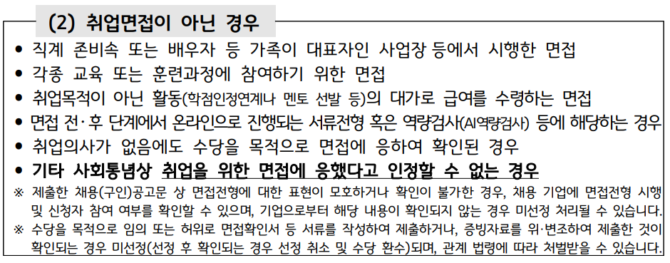※ 취업의사가 없거나 면접 사실이 없음에도 수당을 목적으로 임의 또는 허위로 면접확인서(혹은 대체서약서)를 작성하여 제출하거나, 증빙자료를 위·변조하여 제출한 것이 확인되는 경우 미선정(선정 후 확인되는 경우 선정 취소 및 수당 환수)되며, 관계 법령에 따라 처벌받을 수 있습니다. ※ 면접확인서 이외의 필수제출서류를 반드시 확인하여 함께 제출하십시오.
